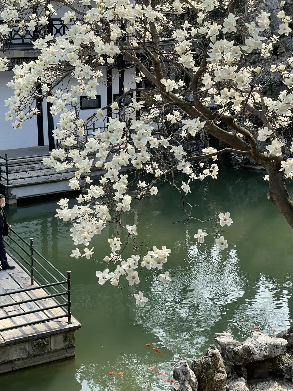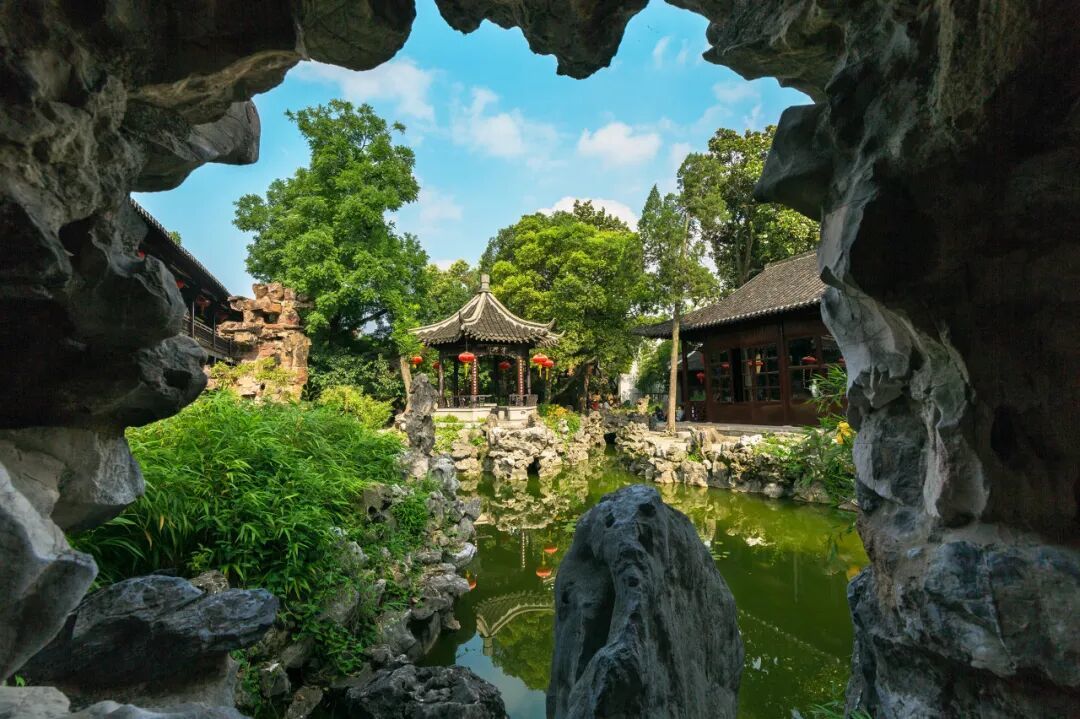 漫步回廊,窗外的假山、流水、花木一步一景,园中的片石山房据说是石涛和尚的手笔,假山里的月洞映出“水中月”奇景,虚实相映。